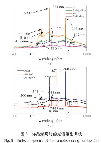 Fig.7 Combustion process of the samples对AP/铝锂合金与AP/铝镁合金样品燃烧过程中的光谱辐射特性进行分析,并与铝单质、镁单质、铝镁合金在空气中燃烧时的光谱辐射曲线进行对比,结果如图8所示。从图8可知,铝单质、镁单质、铝镁合金在空气中燃烧时,在590、671和768nm处均存在辐射峰。不同的是,铝单质和镁单质在470~530nm之间存在不同的特征辐射峰。其中,铝单质在485nm和510nm处分别存在两个特征辐射峰,镁单质在500nm和518nm处分别存在两个特征辐射峰。对于铝镁合金而言,其同样在500nm和518nm处观察到了两个特征辐射峰,说明当铝镁合金在空气中燃烧时,其气相燃烧主要为镁的燃烧。而对于含有AP的样品,同样在590、671、768nm处观察到了3个特征辐射峰。同时,对于AP/铝锂合金样品而言,其671nm处的特征辐射峰相对强度有所增加,485nm和768nm处特征辐射峰相对强度降低。对于AP/铝锂合金,其在485nm和510nm处观察到了与铝单质燃烧时相似的特征辐射峰,表明AP/铝锂合金燃烧时存在铝的气相燃烧。对于AP/铝镁合金,其不仅在485nm和510nm处观察到了特征辐射峰,还在500nm和518nm处也观察到了特征辐射峰,说明AP/铝镁合金燃烧气相火焰中同时存在镁的气相燃烧和铝的气相燃烧。
