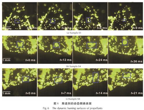 为更好地研究铝粉在HTPB推进剂燃烧表面的燃烧过程,探索铝含量和OF对其燃烧过程的影响,采用显微高速摄影装置对推进剂常压下燃烧表面进行观察,结果见图6。