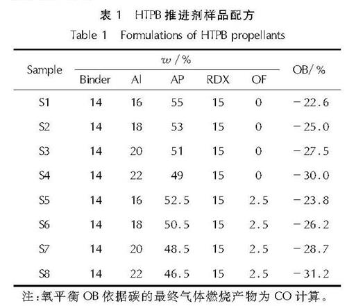 通常高铝含量HTPB推进剂中铝粉的质量分数能达到18%,而有关更高铝粉含量下HTPB推进剂的能量、燃烧性能等还鲜有报道。本研究制备了铝粉质量分数为16%~22%的HTPB/AP/RDX/Al推进剂,并分别加入含氟有机物OF作为对照,以探究铝含量和OF对HTPB推进剂能量和燃烧性能的影响,分析OF促进铝粉燃烧的机理。