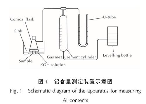 根据燃烧产物中残余的铝与饱和KOH溶液反应生成的氢气含量计算出残留的铝含量(实验装置如图1所示),计算公式如下: