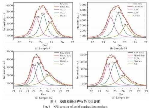 不同配方推进剂凝聚相燃烧产物的元素分析如图4所示。图中Al2O3①和Al2O3②代表不同晶型的氧化铝。Oxides代表铝的氧化物,包括AlO、Al2O、AlO2等。对于空白配方(S1和S4)而言,凝聚相燃烧产物主要含有不同晶型的氧化铝以及铝的氧化中间产物(AlO、Al2O、AlO2等),而对比配方(S5和S8)的凝聚相燃烧产物中除了含有氧化铝以及铝的氧化中间产物外,还产生了AlF3,AlF3的密度低于Al2O3,因此当铝表面致密的Al2O3薄膜被AlF3取代时,就为内部包覆的铝和外部的氧环境提供了一个更宽的通道,增大了铝和氧环境的接触,从而促进铝的燃烧,提高铝的燃烧效率。此外,通过XPS分析并未发现铝的特征峰,这可能是由于XPS仪器探针的测量深度有限,而铝表面Al2O3或AlF3膜的厚度超过了这一探测深度。