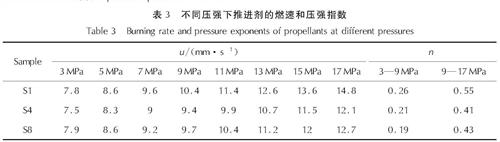 Table 3 Burning rate and pressure exponents of propellants at different pressures由表3可知,高压阶段(9~17MPa)燃速对压强的敏感性显著提高,燃速压强指数约为低压阶段(3~9MPa)的2倍。同时无论在哪个压强段,铝含量的提高均可略微降低燃速对压强的敏感性,而OF对燃速压强指数的影响不大。