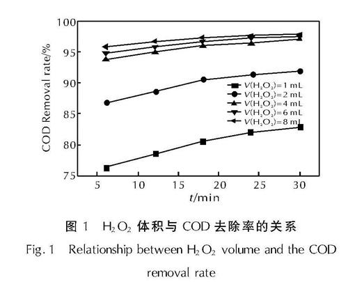 Fig.1 Relationship between H2O2 volume and the COD removal rate由图1可看出,随着H2O2体积增多,COD去除率增高。在H2O2体积为1mL时,COD去除率显著低于2、4、6、8mL时的值。当反应进行到6min时,体积为4、6、8mL的COD去除率即可达93.5%以上,而当反应时间延长至10~30min时,COD去除率增高幅度不大。由此可得,在微波、活性炭存在下,Fenton反应在较短的时间内就能趋于平衡。当H2O2体积增加到4mL时,COD在30min时的去除率已达97.1%。这是因为[15]:随着H2O2体积的增加,·OH生成速率增加,[Fe(HO2·)]2+形成速率增大,使得 Fe2+的生成速率加快,H2O2分解生成·OH的速率随之增加。考虑到成本因素,H2O2取4 mL为佳。