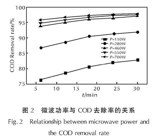 Fig.2 Relationship between microwave power and the COD removal rate由图2可得,微波功率不同,COD去除率均随时间延长而增高,且功率越大,去除率就越高,达到平衡所需时间就越短。当进行到30min时,460、550、700W条件下的COD去除率都趋于97%~98%。增大微波功率,虽能增加Fenton反应速率,但对COD去除率影响甚微。分析认为,增大微波功率,使Fenton反应速率提高; 同时,可使活性炭表面的“热点”数量增加,强化活性炭对COD的吸附作用,使得去除率增高。综合考虑,微波功率选取460W最佳。