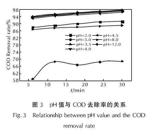 Fig.3 Relationship between pH value and the COD removal rate从图3可看出,COD在反应前6 min内去除较为明显。当pH值分别为2、3、3.5、4、4.5、8时,反应在6min内COD去除率已较大,而后趋于平衡。pH值为3.5时COD去除率最高,达97.5%。而当pH值为12呈弱碱性时,COD去除率仅为68.9%。