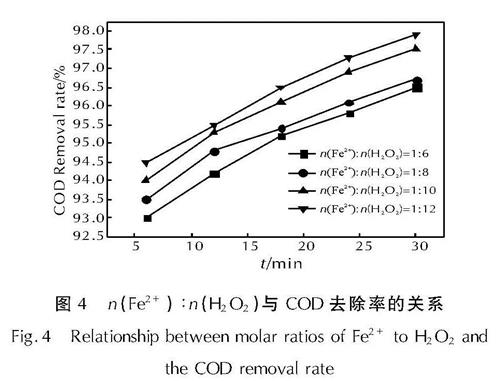 Fig.4 Relationship between molar ratios of Fe2+ to H2O2 and the COD removal rate由图4可看出,随着n(Fe2+):n(H2O2)的减小,COD去除率增高,但各n(Fe2+):n(H2O2)比值条件下的COD去除率增幅不太明显,比值为1:6与1:8时的COD去除率较为接近,反应30min时可达96.5%以上; 比值为1:10与1:12时的COD去除率相差不大,反应30min时可达97.5%以上。这说明Fe2+是促使H2O2分解产生·OH的催化剂。Fe2+浓度不高时,H2O2较难产生·OH,反应速率低; 随着Fe2+浓度的增大,反应速率加快; Fe2+浓度继续增加,过量Fe2+可能和·OH起反应,不断消耗掉·OH,使Fenton反应速率减慢,降低COD去除率。因此,选择n(Fe2+):n(H2O2)= 1:10较为合适。