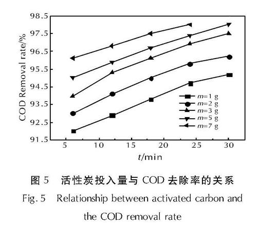 Fig.5 Relationship between activated carbon and the COD removal rate由图5可看出,随着活性炭投入量的增大,COD去除率增高。这是由于活性炭有着良好的吸附作用,活性炭用量越多,比表面积越大,吸附性能越好。随着活性炭投入量的增加,越来越多的“热点”(在微波辐射下,可观察到活性炭表面出现火花)在微波场中形成,此“热点”处能量与温度比其他地方高出许多[17],被吸附的物质易于在该位点上发生物理化学作用,催化降解速率加快,对污染物的去除有利。这种将微波能量得以聚集并释放给水中污染物使之氧化分解的结果表明,活性炭的作用符合催化剂的定义,在本反应中活性炭几乎无消耗。COD去除率在活性炭质量为7g时达最高。但当活性炭质量大于5g后,COD去除率仅略为增高。因此,选取5g活性炭进行实验研究。
