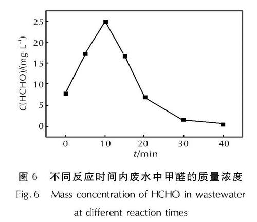 Fig.6 Mass concentration of HCHO in wastewater at different reaction times由图6可知,未经处理的废水中已含有质量浓度为7.9mg/L的甲醛,这可能是由于久置的缘故,有少量甲醛生成。随着反应时间的延长,UDMH逐渐降解,甲醛的质量浓度发生了变化。反应起始,甲醛的质量浓度急剧增加,10min时达到峰值。此后,甲醛质量浓度迅速降低,在30min处甲醛质量浓度已经极少,这表明甲醛是活性炭-微波-Fenton反应降解UDMH的一种中间产物。此外,甲醛质量浓度在10min后呈直线状降低也证明了该反应体系具有超强的氧化能力。