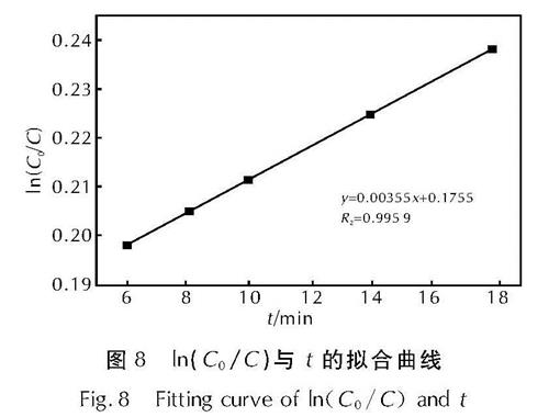 由上述最佳反应体系处理废水的结果,探讨COD去除率的动力学规律。以反应时间t为横坐标、ln(C0/C)为纵坐标作图(C0为废水水样中COD的初始质量浓度,C为处理后水样中COD的质量浓度),结果如图8所示。