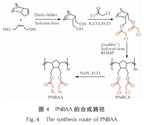 与双键相比,羟基结构具有更高的反应活性,更易于通过取代反应及缩合反应等完成含能衍生化。2018年,Huang等[33]报道了一种新型双叠氮化乙酰氧基甲基侧链的含能聚降冰片烯结构(PNBAA)的合成。该方法以Diels-Alder反应构建双羟基结构,对所得的双羟基结构首先完成氯乙酰化,随之进行“一锅法”的无溶剂开环聚合[34-35](ROMP)-叠氮化,在开环聚合所得高分子骨架的基础上,在侧链羟基结构中进一步引入叠氮基。