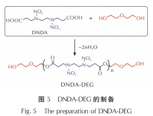 Fig.4 The synthesis route of PNBAA2020年,Kim等[36]利用二甘醇的双羟基结构与高能单体DNDA的羧基末端的羧基发生缩合反应,快速合成了含能聚合物DNDA-DEG(见图5)。由于两种反应物同时具备较高的反应活性,因此通过混合加热即可高效完成该转化。