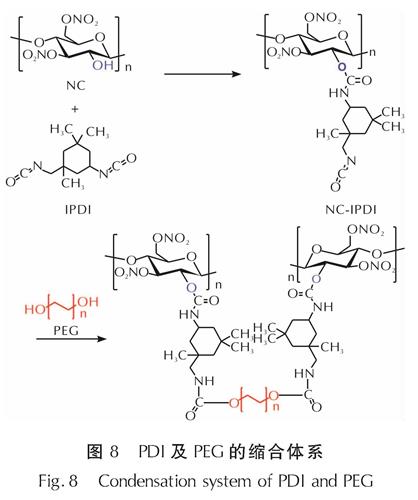 2018年,肖正刚等[42]利用硝化纤维素中裸露的羟基与PDI及PEG等单元进行缩合反应,实现了对线性硝化棉结构的连接(见图8),进而形成空间上二维体系排列的新型含能聚合物结构[43-45]。该类结构整体空间排列呈现阶梯状,较之硝化纤维素本身,其机械感度降低,撞击感度(H50)为60cm,摩擦感度为24%。此外,在175~450 ℃的分解行为也更加平缓。