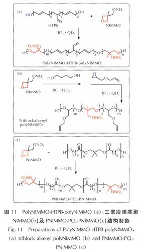图11 PolyNIMMO-HTPB-polyNIMMO(a),三嵌段烯基聚NIMMO(b)及PNIMMO-PCL-PNIMMO(c)结构制备