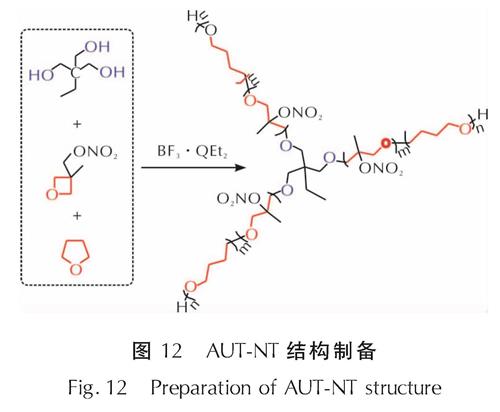 Fig.12 Preparation of AUT-NT structureGAP由高正生成热的聚醚主链和叠氮基团组成,在燃烧时可以释放出大量的热量与气体,因其卓越的能量密度水平和独特的力学性能成为含能材料领域的热点结构,发展出了线型GAP、支化GAP和GAP共聚等[56-58]多种相关体系。2018年,Hafner等[59]针对常规GAP玻璃化转变温度较高,机械性能较HTPB类推进剂差等问题,将非极性烷基侧链引入到GAP极性聚醚主链中,采用阳离子开环聚合法合成了环氧氯丙烷与1,2-环氧化己烷(EpH)的线性共聚物(见图13),有效降低了分子间力与分子内力,获得了较低黏度与玻璃化转变温度。
