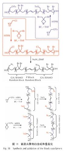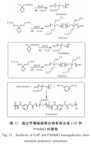 Fig.14 Synthesis of GAP and PAMMO homopolymers from mesylate polymeric precursors2019年,Xu等[63]报道了聚[3,3-双(2,2,2-三氟乙氧基甲基)氧杂环丁烷]乙二醇嵌段-聚(3-硝基甲基-3-甲基氧杂环丁烷)(PBFMO-b-PNMMO)的合成制备研究(见图15)。