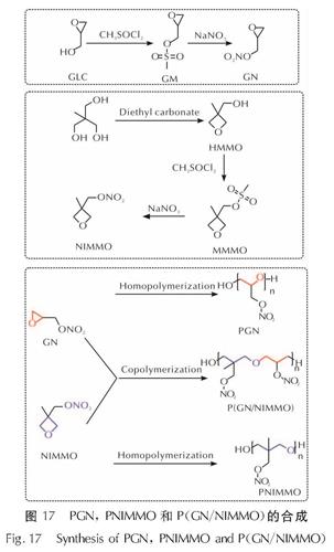 Fig.16 Synthesis of the triblock copolymer PPG-GAP-PPG2018年,Dong等[66]通过亲核取代反应合成了硝酸缩水甘油酯(GN)和3-硝基甲基-3-甲基氧化乙烯,然后通过阳离子开环聚合合成了自聚合的聚硝酸缩水甘油酯(PGN)和聚3-硝酸酯甲基-3-甲基氧杂丁环(PNIMMO),以及共聚合产物P(GN/NIMMO)(见图17)。PGN、PNIMMO和P(GN/NIMMO)的Tg均较低,且流变性研究表明,PGN和P(GN/NIMMO)的零剪切黏度低于PNIMMO。