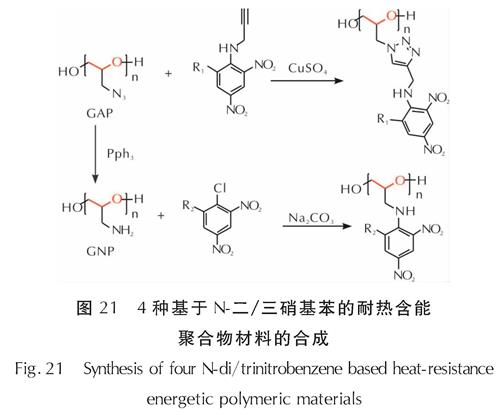 2020年,Fan等[73]利用GAP中叠氮基团与炔烃发生1,3-偶极环加成反应,形成三唑桥键连接三硝基苯胺含能片段的独特改性GAP含能聚合物,此外,通过氨基取代GAP体系中叠氮基团后进一步与苦基氯发生芳基亲核取代反应,可形成不含三唑桥键的连接三硝基苯胺含能片段的改性GAP含能聚合物(见图21)。此类体系由于连接三硝基苯类含能基团,能量水平得到进一步提升,耐热性能极佳,分解峰温最高达到336.7℃,撞击感度IS>20J,摩擦感度FS>360N。