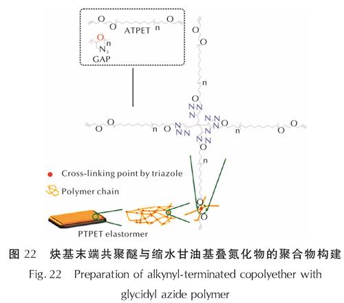Fig.22 Preparation of alkynyl-terminated copolyether with glycidyl azide polymer2015年,Kim等[75]利用含叠氮基聚合物与多种具有两个或三个末端炔烃结构在无溶剂和催化剂的情况下进行1,3-偶极环加成实现了网络状聚合物合成(见图23)。其中,含α-羰基的亲偶极体在几分钟内即可实现的Huisgen反应。在环加成反应的同时引入了形成氨基甲酸酯的反应,以连接GAP链端并避免形成诸如悬链的缺陷。