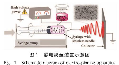 纳米复合纤维的制备方法有多种,如拉伸法、模板法、相分离法、自组装法和静电纺丝法等[4-6]。其中,静电纺丝法以操作简单、成本低廉、过程连续、生产效率高、应用范围广等优点引起人们的高度关注,现已成为直接制备纳米纤维材料的主要方法之一。静电纺丝法制备的纳米复合纤维具有较大比表面积、较高孔隙率、高柔韧性、大长径比和超强机械性能等特性,被广泛应用于纳米传感器、光催化、过滤阻隔材料、电极材料、智能穿戴、生物医疗等领域[7-10]。静电纺丝过程中,通过工艺参数的调节,可以实现纤维直径在几十纳米到几微米范围内的可控调节,从而满足不同领域的应用需求[11-13]。同时,改变聚合物基质溶液的组成,可以得到具有不同表面结构和功能的纳米纤维复合材料,进而满足不同领域对纤维材料的差异化功能需求[14-15]。