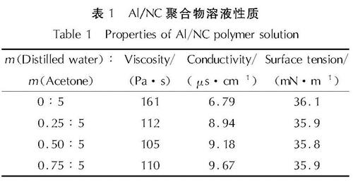 Xie等[25]详细研究了聚合物溶液性质(见表1和图2)和电压对Al/NC复合纤维形貌的影响。由图2可知,当聚合物溶液黏度和电导率较低时,静电纺丝过程中前驱体溶液的拉丝行为较差,纤维产物中有较多块状材料出现。随着聚合物溶液黏度和电导率的增大、表面张力的减小,产物中块状材料逐渐减少,得到直径均匀和表面光滑的纳米纤维。