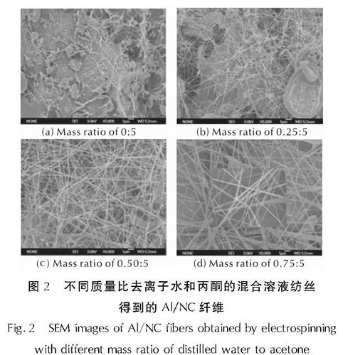 Fig.2 SEM images of Al/NC fibers obtained by electrospinning with different mass ratio of distilled water to acetone静电纺丝纤维的形成是多种因素综合作用的结果,其中纺丝液黏度的影响最为关键,决定着纤维产物的组成和表面结构,同时还影响着过程工艺参数的确定。环境因素的变化会引起纺丝液理化性质的改变进而间接影响纤维的尺寸和形貌特征。静电纺丝过程中各种参数之间相互作用、彼此影响,共同促成了不同组成、结构和形貌的超细功能化纳米纤维的形成。