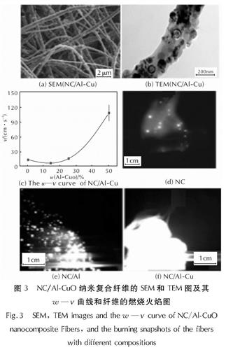 图3 NC/Al-CuO纳米复合纤维的SEM和TEM图及其w—v曲线和纤维的燃烧火焰图