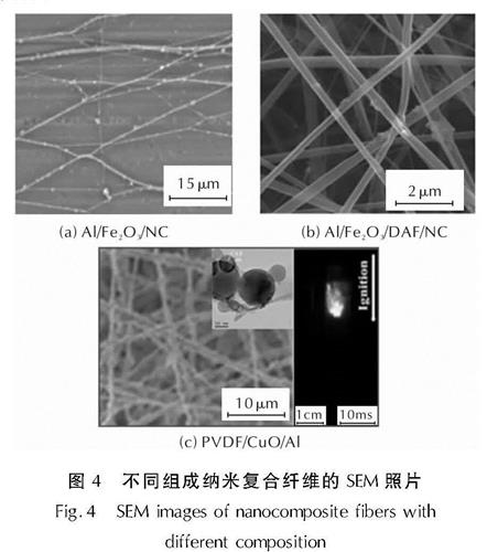 Fig.4 SEM images of nanocomposite fibers with different composition研究表明,静电纺丝技术一方面能够有效抑制铝热剂型含能复合材料中纳米Al粉和金属氧化物颗粒的团聚现象,提高复合纤维燃烧过程中的传质和传热速率。另一方面,复合含能纤维材料中纳米Al粉被高分子聚合物包覆,能够显著增强存储过程中Al粉的抗氧化能力,提高其存贮和安全特性。