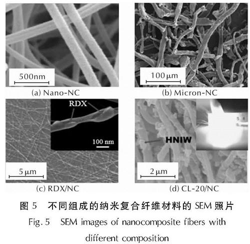 Table 2 Comparison of thermal behaviors and kinetic parameters of micron and nano NC将NC与成气性高、燃烧温度低、能量密度大的硝胺类化合物如HMX、RDX、CL-20等复合纳米化,可以进一步提高推进剂的能量特性。徐红梅等[41]将RDX和NC溶解在丙酮和N, N-二甲基甲酰胺(DMF)的混合溶剂中,通过静电纺丝工艺得到了RDX/NC纳米复合纤维(见图5(c)),并研究了其热分解性能和力学特性。热分析结果表明,RDX/NC纳米复合纤维的热分解温度较RDX、NC及RDX和NC的物理混合样均有降低,放热分解半峰宽变窄、热分解过程加剧。RDX/NC复合纤维热分解性能的提升归因于纤维基体中RDX和NC的紧密接触及较大的比表面积,其加快了反应过程的传热传质速率。力学性能实验表明,RDX/NC复合纤维的弹性模量由于存在氢键(NC结构中的―OH与RDX中的―NO2形成氢键)较NC纤维大幅提高,由47GPa提高至153GPa,增幅达3倍多。Li等[42]通过静电纺丝工艺将CL-20嵌入到聚丙烯腈(PAN)纤维膜中(见图5(d)),研究了CL-20/PAN纳米复合纤维膜的热分解行为和燃烧特性。结果表明,CL-20/PAN复合纤维较CL-20具有更高的热感度,PAN纤维使CL-20的起始分解温度和放热分解峰温分别降低约38℃和19℃。同时,PAN和CL-20的紧密接触使得CL-20/PAN放热速率显著增加。在点火和燃烧试验中,CL-20/PAN纤维表现出显著增强的燃烧特性,火焰亮度增强、燃烧更加充分。CL-20/PAN纤维改善的热分解和燃烧特性,能够很好地满足狭窄空间高点火能量的需求。