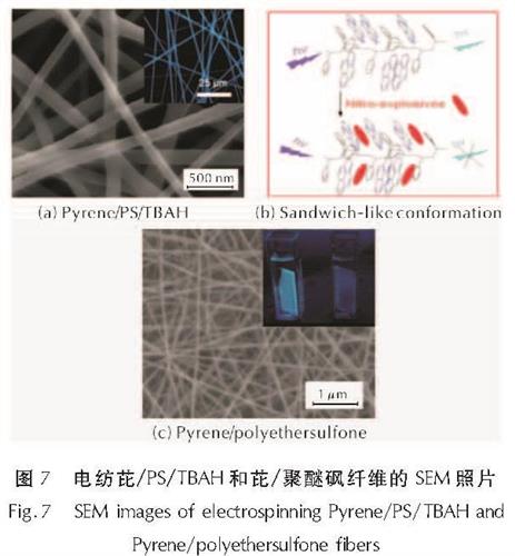 Fig.7 SEM images of electrospinning Pyrene/PS/TBAH and Pyrene/polyethersulfone fibers荧光检测的机理可以概述为荧光分子中激发态的电子与缺电子的化合物受体结合,通过光诱导电子转移(PET)、Forster共振能量转移(FRET)以及内滤效应(IFE)等光物理过程阻断电子在荧光分子中的流动、改变荧光信号形成荧光淬灭,从而达到爆炸物检测的目的[49, 51]。电纺纳米复合纤维由于独特的结构特性如较大的比表面积和多孔结构等,有利于荧光检测过程中爆炸物分子的快速扩散及其与荧光基团的充分接触,从而实现电子的快速转移和爆炸物的痕量检测。电纺纳米复合纤维由于检测灵敏度高、选择性强、经济环保,在含能爆炸物检测中表现出极好的应用前景。