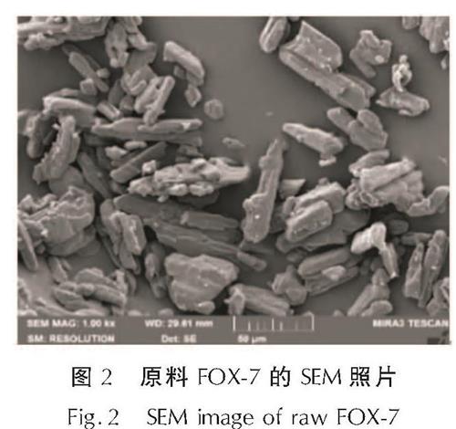 采用场发射扫描电子显微镜(SEM)对FOX-7晶体的形貌进行表征; 采用ImageJ软件对FOX-7晶体粒径进行统计分析; 采用X射线粉末衍射系统(XRD)及傅里叶变换红外光谱仪(FT-IR)对FOX-7晶体的分子结构进行表征; 采用差示扫描量热仪(DSC)对FOX-7进行热分析。
