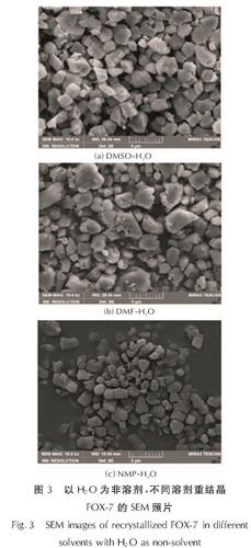 Fig.2 SEM image of raw FOX-7图3 以H2O为非溶剂,不同溶剂重结晶FOX-7的SEM照片