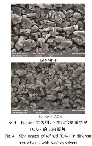 确定溶剂为NMP的情况下,分别以H2O、无水乙醇(ET)以及乙腈(ACN)为非溶剂进行实验。用扫描电镜对细化FOX-7进行表征,结果如图4所示。