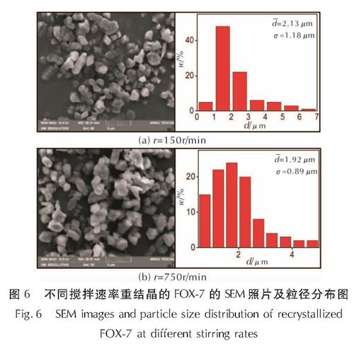 以NMP-H2O为溶剂-非溶剂,药液的质量浓度为0.4g/mL,在搅拌速率分别为150r/min及750r/min条件下进行实验。用扫描电镜对细化FOX-7进行表征,并使用Image J软件对电镜图中的FOX-7晶体的平均粒径d^-以及标准差σ进行统计计算,结果如图6所示。