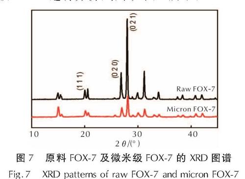 Fig.7 XRD patterns of raw FOX-7 and micron FOX-7由图7可知,原料FOX-7在2θ为20°、26.85°及28°处有明显的特征衍射峰,这3处特征衍射峰分别对应α型FOX-7的(1 1 1)、(0 2 0)以及(0 2 1)3个晶面。而细化后的微米级FOX-7与原料FOX-7的XRD图谱基本一致,说明微米级FOX-7具有较好的结晶度,且与原料FOX-7均为α型FOX-7。