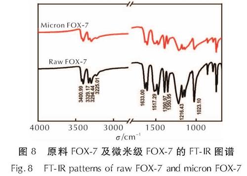 为了进一步表征FOX-7的结构,使用傅里叶变换红外光谱仪对微米级FOX-7与原料FOX-7进行了红外光谱分析,结果如图8所示。