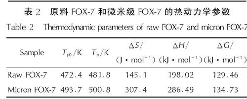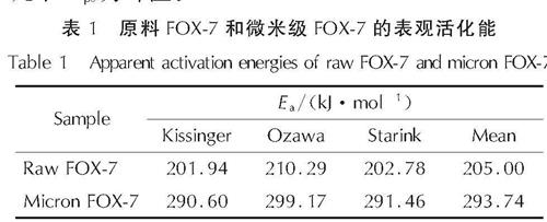 Table 1 Apparent activation energies of raw FOX-7 and micron FOX-7表2 原料FOX-7和微米级FOX-7的热动力学参数